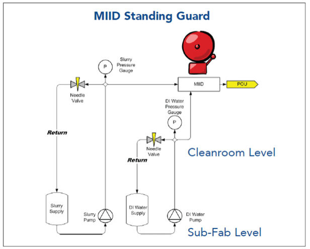 To optimize the CMP process, it is imperative that the dedicated supplies of chemical slurry and DI water not be allowed to commingle; allowing this to happen will adversely affect the slurry’s ability to deliver the demanded level of smoothness to the wafer’s surface. However, some semiconductor manufacturers noticed slurry contamination with DI water within their CMP systems, which led to lost wafers, overall reduced yields and unwanted repair, replacement and cleanup costs.