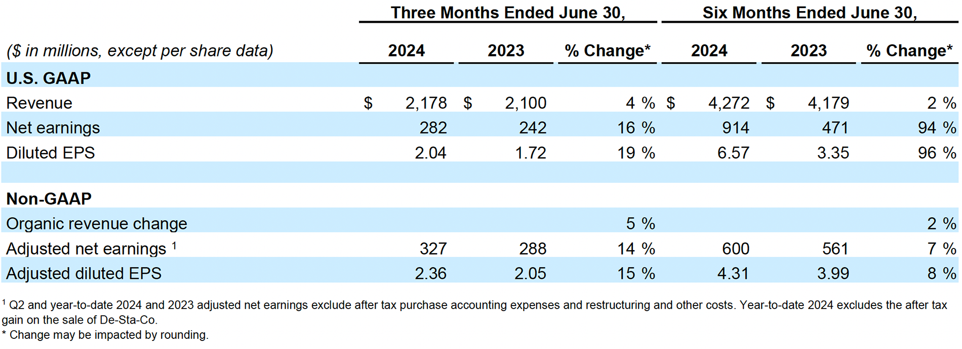 For the six months ended June 30, 2024, Dover generated revenue of $4.3 billion, an increase of 2% (+2% organic) compared to the prior year. GAAP net earnings of $914 million increased by 94%, and GAAP diluted EPS of $6.57 was up 96%. On an adjusted basis, net earnings of $600 million increased 7%, and adjusted diluted EPS of $4.31 was up 8% compared to the prior year.