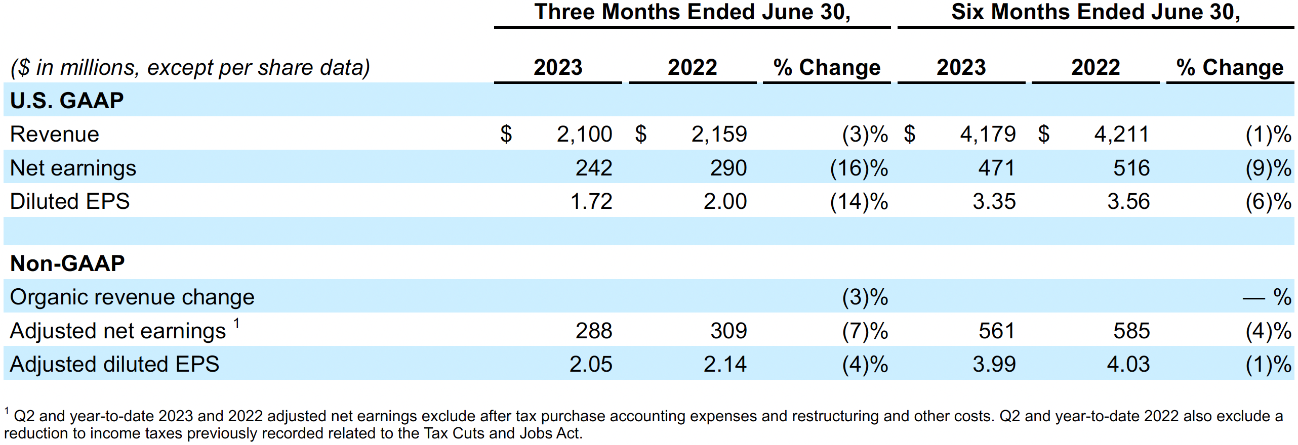 For the six months ended June 30, 2023, Dover generated revenue of $4.2 billion, a decrease of 1% (flat organic). GAAP net earnings of $471 million decreased 9%, and GAAP diluted EPS of $3.35 was down 6%. On an adjusted basis, net earnings of $561 million decreased 4%, and adjusted diluted EPS of $3.99 was down 1%.